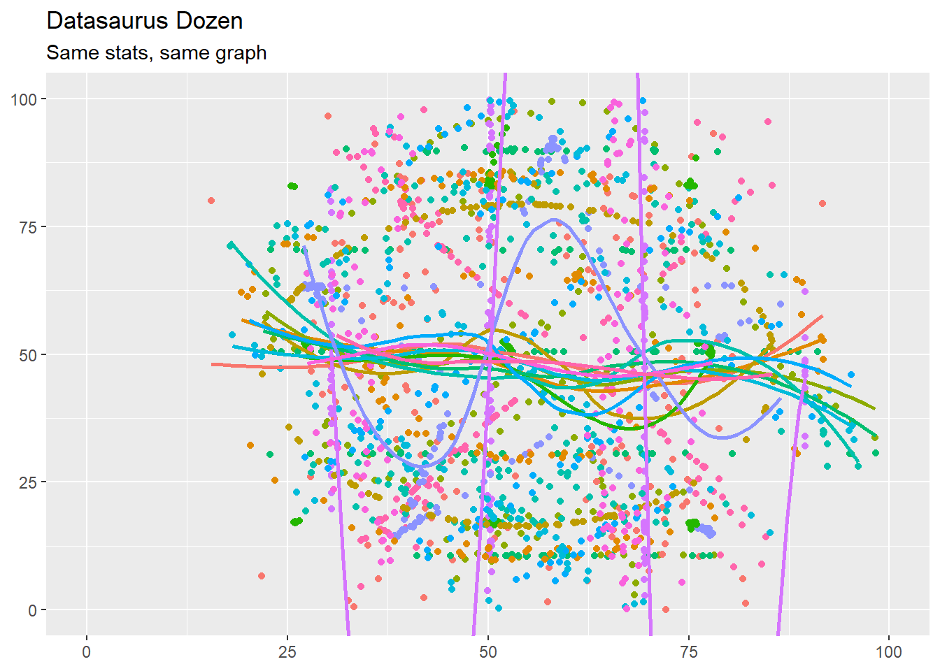 #> 13 x_shape 142Fun fact: Matejka, Justin, and George Fitzmaurice. “Same stats, different graphs: Generating datasets with varied appearance and identical statistics through simulated annealing.” Proceedings of the 2017 CHI Conference on Human Factors in Computing Systems. ACM, 2017.