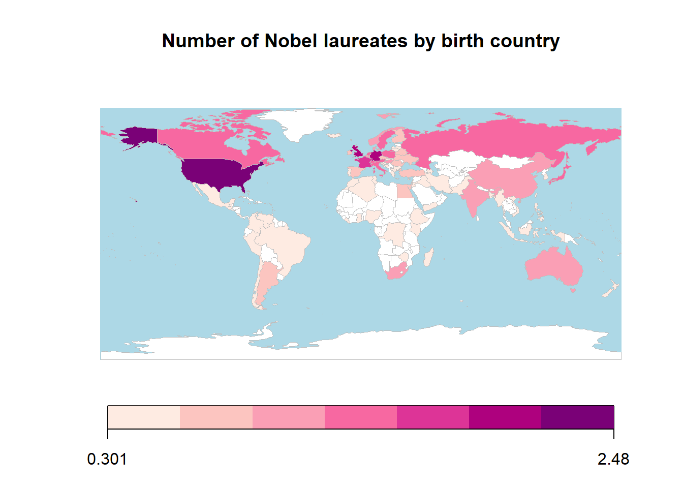 This map provides a global overview of the distribution of Nobel laureates based on their birth countries. Countries with higher numbers of laureates are represented with darker shades, while those with fewer or no laureates are shown in lighter shades or white. These data have been log-transformed to ensure better visualization across countries with varying counts of laureates. To gain deeper insights, we will now proceed to analyze the data further through a series of exercises.