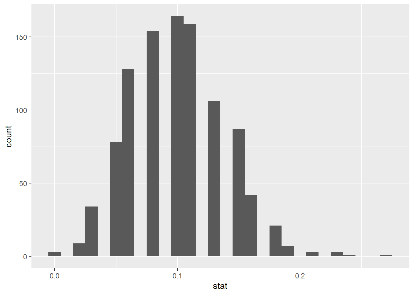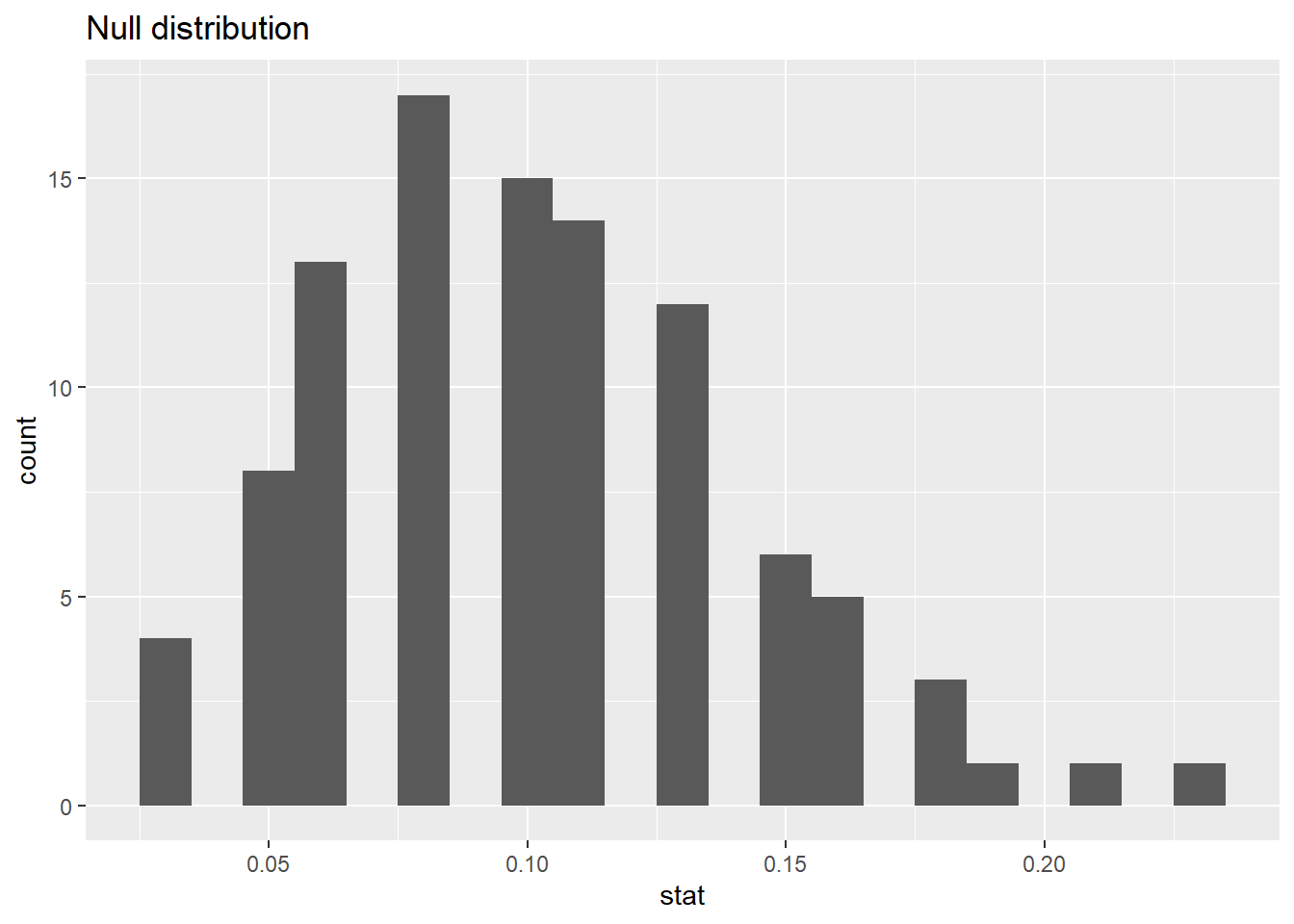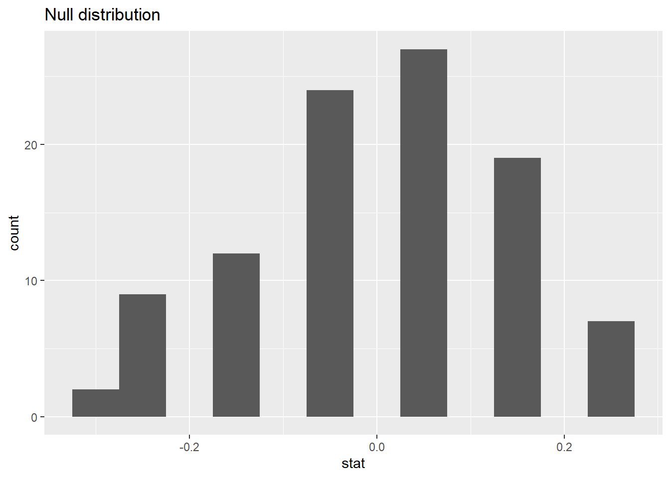 {{ generate(100, type = "permute") }}- Calculate the sample statistic of interest (difference in proportions)