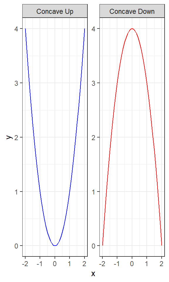 Concave Down (\(y= -x^2\)): Conversely, this plot shows a parabolic curve opening downwards, illustrating a concave down graph where the slope of the tangent line decreases as \(x\) increases.