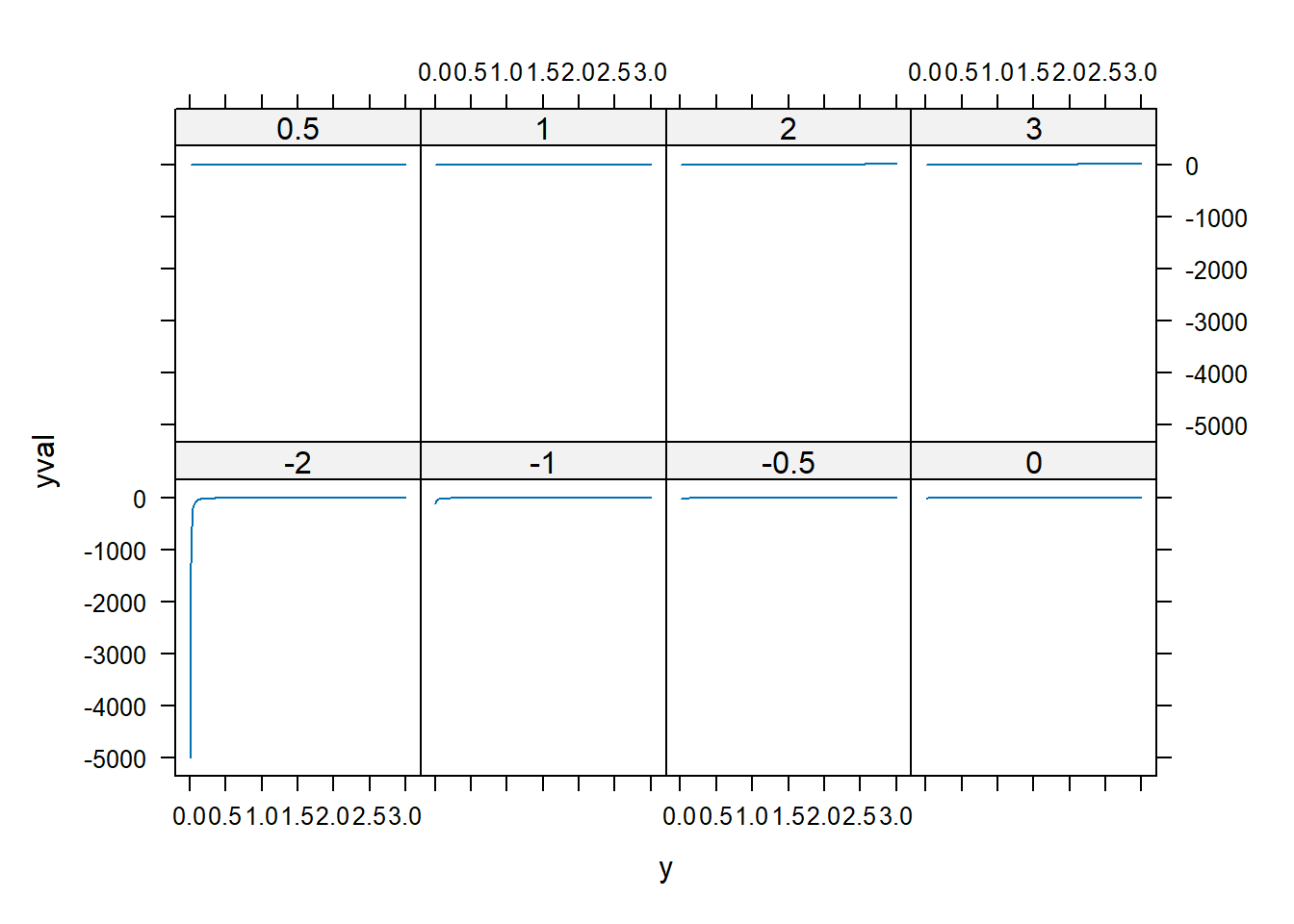xyplot(yval ~ y | factor(p), dd, type = "l")