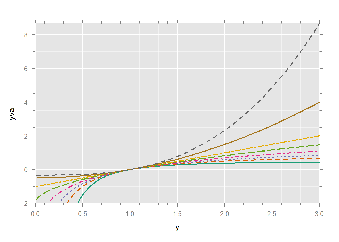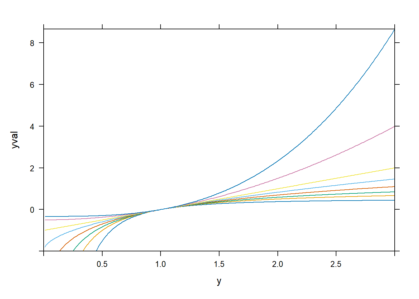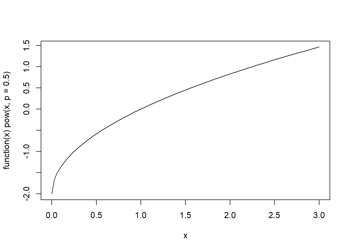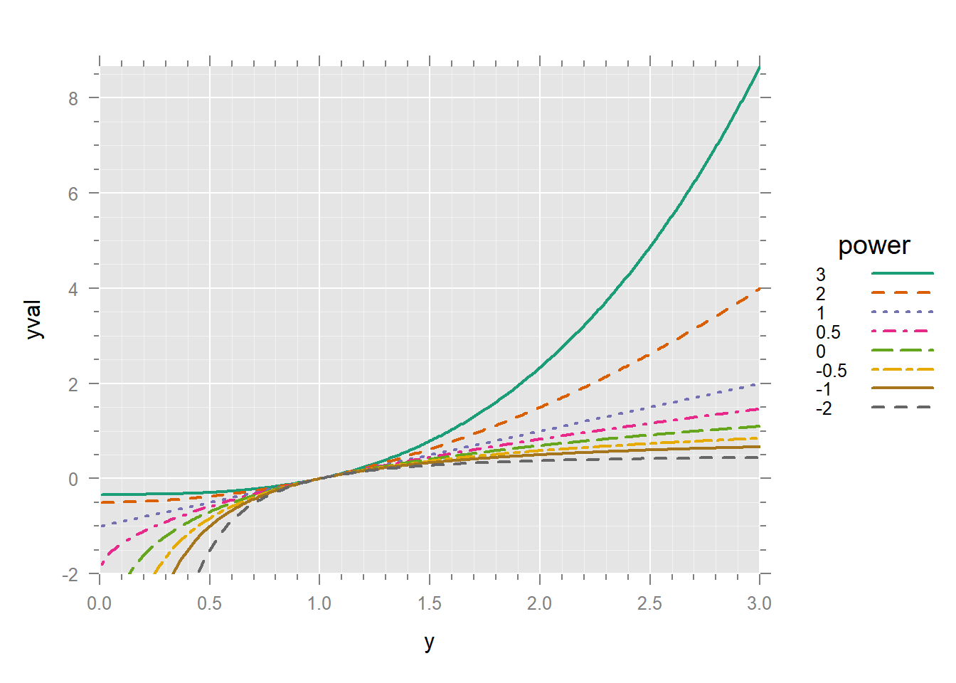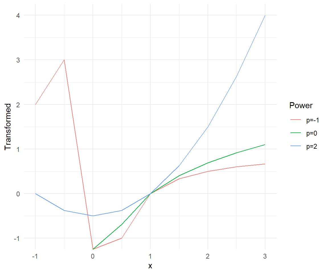 Looking at the plot, we can see how different values of \(p\) affect the transformation of the data. The transformation with \(p=2\) shows a concave up shape, while \(p=-1\) shows a concave down shape. The logarithmic transformation (\(p=0\)) provides a middle ground between these two extremes.