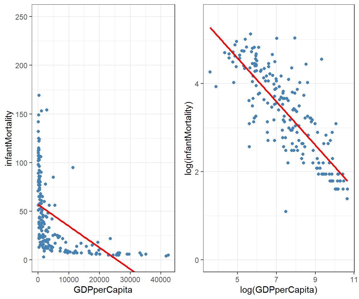mutate(country = rownames(.)) # Assigning country namesLet’s visualize an attempt to make our regression behave. Below are the original and log-transformed relationships with ggplot2. You’ve likely used a log-transformation before, but we’ll be exploring the more general family of transformations.